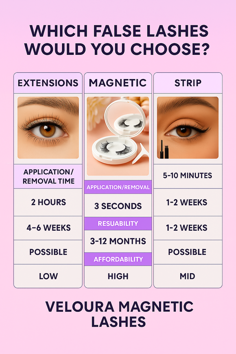 Veloura lashes use soft-magnet bands that snap together around your natural lashes in seconds—no glue required.